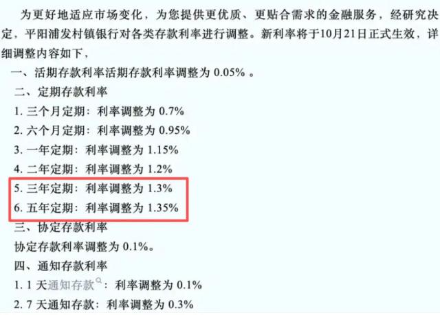 平陽浦發(fā)村鎮(zhèn)銀行公告顯示,10 月 21 日起新一輪各類存款利率調(diào)整生效,整存整取定期產(chǎn)品各期限分別下調(diào)不同基點。這意味著,10 月 21 日后,在該銀行存 100 萬的三年期定存,會比之前減少 2.4 萬,相當(dāng)于少了華為手機、電腦等全家桶,確實讓人心痛。那么,大家還愿意繼續(xù)存嗎?歡迎在評論區(qū)留言。