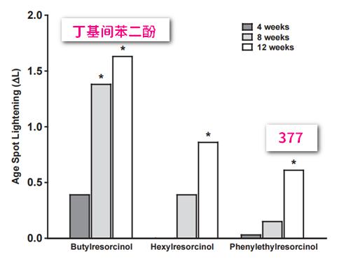 平時不出手,出手必卷同行的言之有物,成分猛,價格狠!在拜爾斯道夫的一篇論文的實驗中,發(fā)現(xiàn) 577 僅需 4 周就能夠顯著改善色斑,而且效果約是 377 的 6 倍!