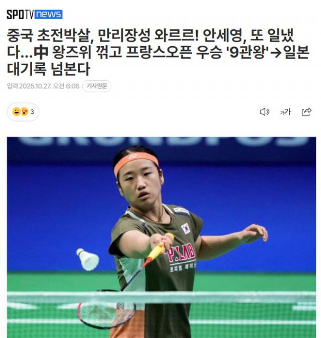 北京時間10月27日,韓媒《Spotv News》發(fā)文稱,羽毛球女帝安洗瑩連續(xù)擊敗高昉潔、陳雨菲、王祉怡三位中國羽毛球名將,在法國公開賽奪冠,達(dá)成賽季第九個冠軍。