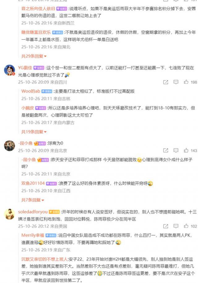 賽后,王祉怡遭到了球迷們的炮轟。有球迷質(zhì)疑,如果不是陳雨菲奧運(yùn)會(huì)后大半年不參賽,安洗瑩受傷許久,王祉怡根本上不了世界第二的位置;還有球迷覺(jué)得王祉怡空有好的身體素質(zhì)卻一直不開(kāi)竅;也有人指出,前一天安洗瑩和陳雨菲拼得那么激烈,王祉怡卻還是脆??;另外,有球迷認(rèn)為王祉怡需要加強(qiáng)心理建設(shè),她已經(jīng)遭遇7連敗,這樣下去很難有好成績(jī);甚至有球迷覺(jué)得陳雨菲是簽位不好,不然早就回到世界第二了。