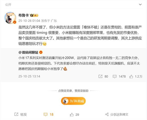 魅族員工布魯卡指出,小米17系列先發(fā)優(yōu)勢明顯,國慶檔對其銷量貢獻(xiàn)巨大。其他品牌若想跟進(jìn),就必須調(diào)整自身的研發(fā)周期,同時(shí)上游供應(yīng)鏈也需同步配合。