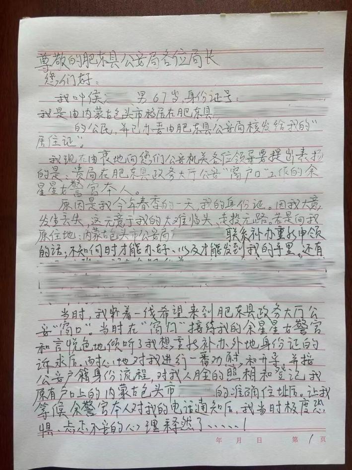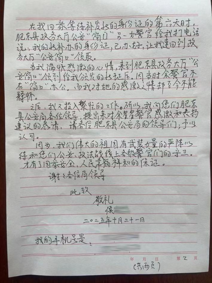10月22日,67歲的侯大爺將一封情真意切的手寫感謝信送到了肥東政務(wù)服務(wù)中心,向民警余星星表達(dá)謝意。