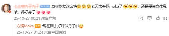 有網(wǎng)友關(guān)心方媛:“身材恢復(fù)這么快,老天太眷顧moka了,還是要注意休息哦,養(yǎng)好身子。”方媛和網(wǎng)友互動(dòng)稱:“現(xiàn)在回去好好做月子啦?!?/p>