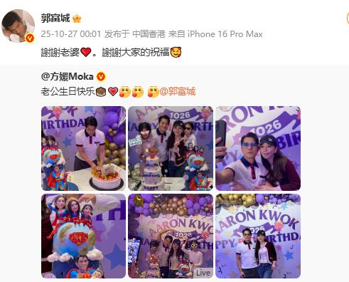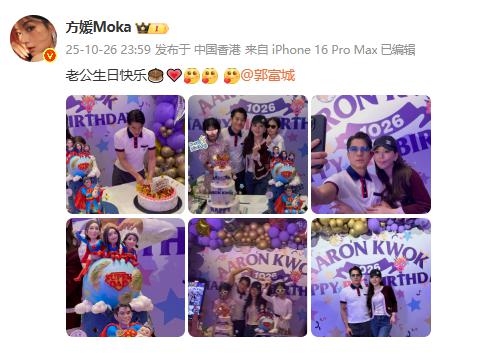 10月26日,剛生完三胎女兒的方媛,從月子中心出來為郭富城慶祝60歲生日。方媛在社交平臺(tái)更新了全家福,并配文“老公生日快樂”。