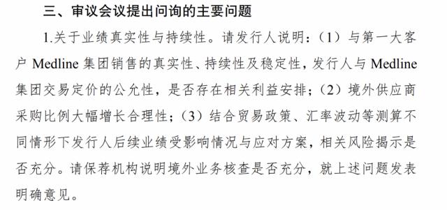 在審議會議上,北交所提出多項要求。一是要求愛舍倫說明與第一大客戶Medline集團銷售的真實性、持續(xù)性及穩(wěn)定性,公司與Medline集團交易定價的公允性,是否存在相關利益安排;二是說明境外供應商采購比例大幅增長的合理性;三是結合貿易政策、匯率波動等測算不同情形下公司后續(xù)業(yè)績受影響情況與應對方案,以及相關風險揭示是否充分。