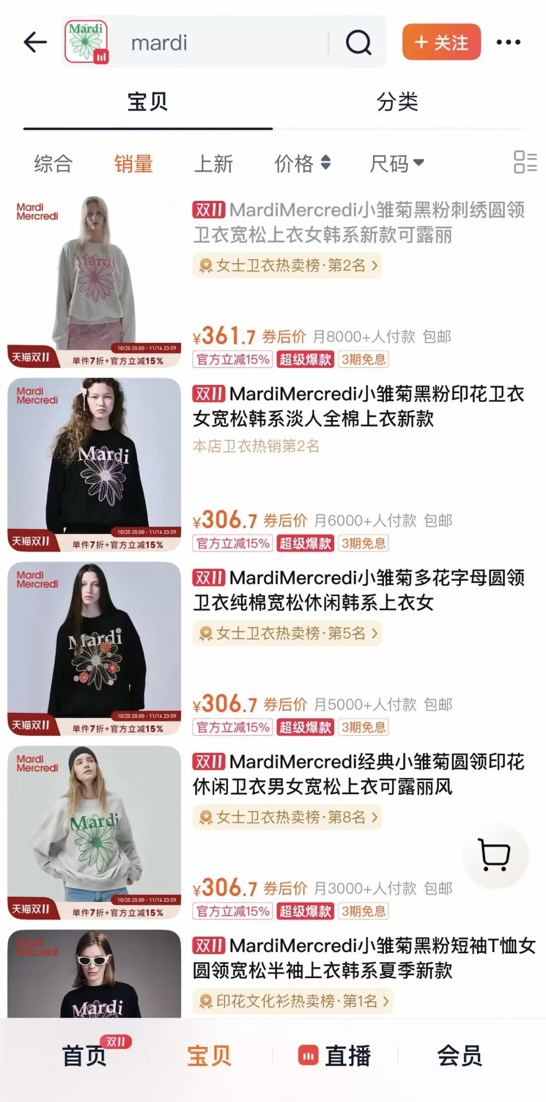 Mardi Mercredi更是憑借代言人金高銀的清爽氣質(zhì)成為松弛感、都市感的代名詞。其熱門款衛(wèi)衣和T恤在天貓旗艦店累計(jì)售出近20萬(wàn)件。