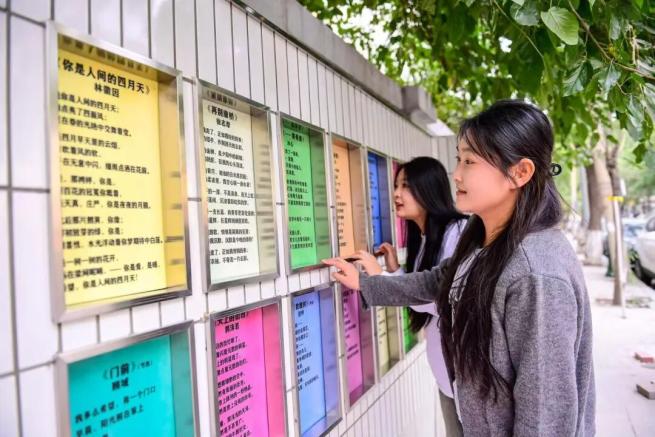 一面新設的詩歌墻成了巷中焦點,72塊彩色陶瓷板上刻著《你是人間四月天》《再別康橋》等十首激動人心的詩篇。