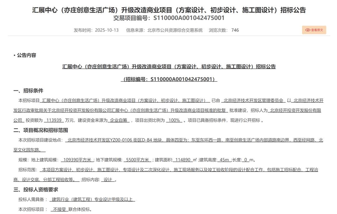近日,北京市公共資源交易服務(wù)平臺發(fā)布消息,亦莊創(chuàng)意生活廣場(匯展中心)正式開啟約11.4億元的升級改造工程。該項目由北京經(jīng)開投資開發(fā)股份有限公司投資建設(shè),目前已完成項目核準,進入設(shè)計招標階段。