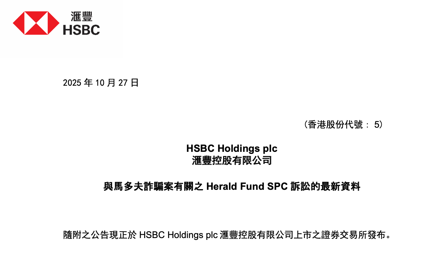 匯豐控股公告截圖