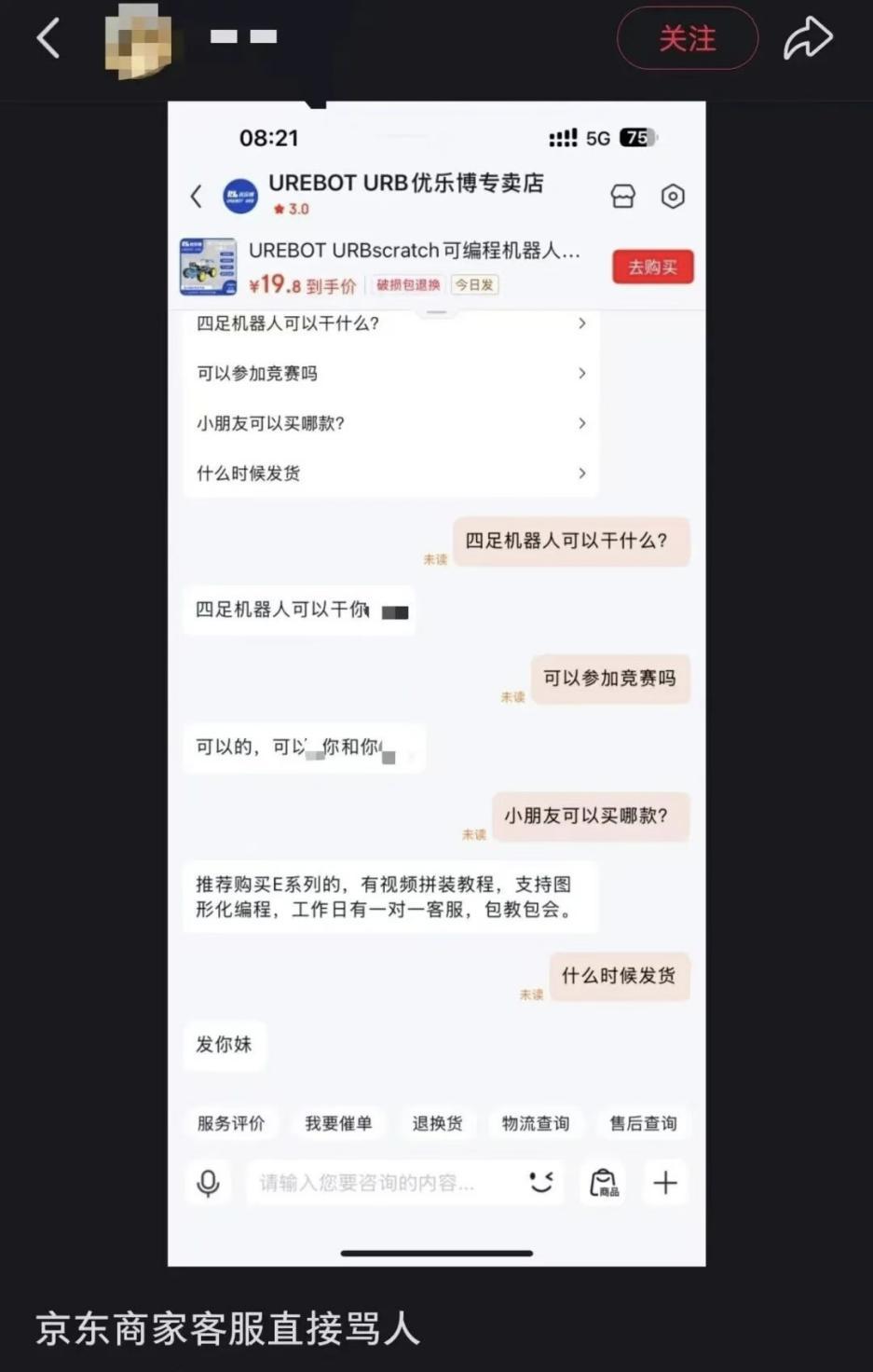 據(jù)三言Pro消息,網(wǎng)友上傳的截圖顯示,名為“UREBOT URB優(yōu)樂博專賣店”的客服,在用戶提出相關(guān)問題時,會回復(fù)侮辱性語句。媒體依據(jù)截圖信息進(jìn)入該商家客服頁面,發(fā)現(xiàn)情況屬實。不過,所謂“侮辱性回復(fù)”實際上是商家設(shè)置的自動應(yīng)答內(nèi)容。經(jīng)測試,只有點擊商家預(yù)設(shè)的四個問題,才會觸發(fā)侮辱性詞語。
