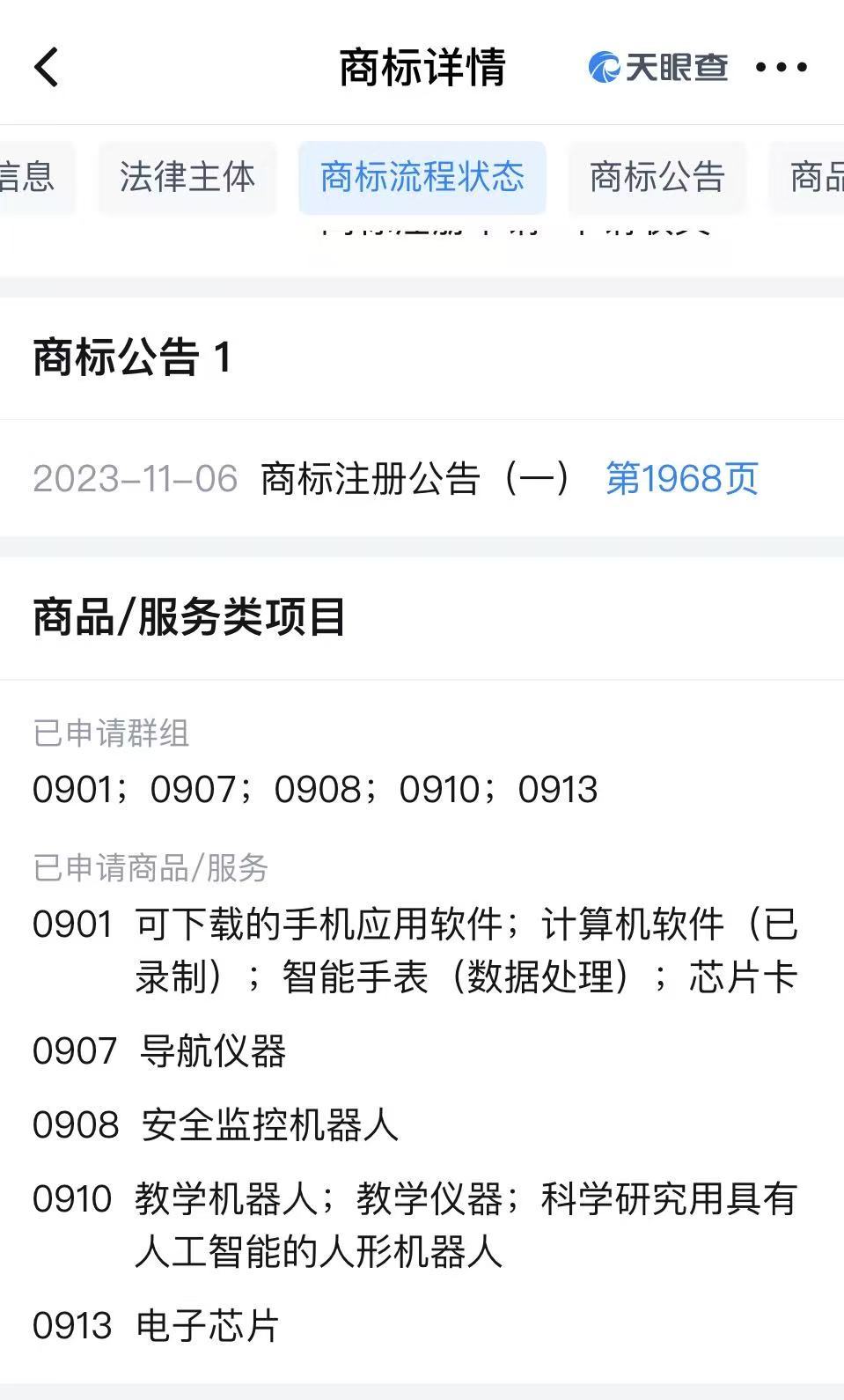 天眼查顯示,該店運營方“北京優(yōu)樂博科技有限公司”于2022年4月成立,注冊資本20萬人民幣,是一家從事科技推廣和應(yīng)用服務(wù)業(yè)的企業(yè),員工人數(shù)顯示為0人。其商標(biāo)“UREBOT URB”于2022年11月申請,2023年11月商標(biāo)注冊成功。已申請服務(wù)包含:可下載的手機(jī)應(yīng)用軟件、計算機(jī)軟件(已錄制)、智能手表(數(shù)據(jù)處理)、芯片卡、導(dǎo)航儀器、安全監(jiān)控機(jī)器人、教學(xué)機(jī)器人等。
