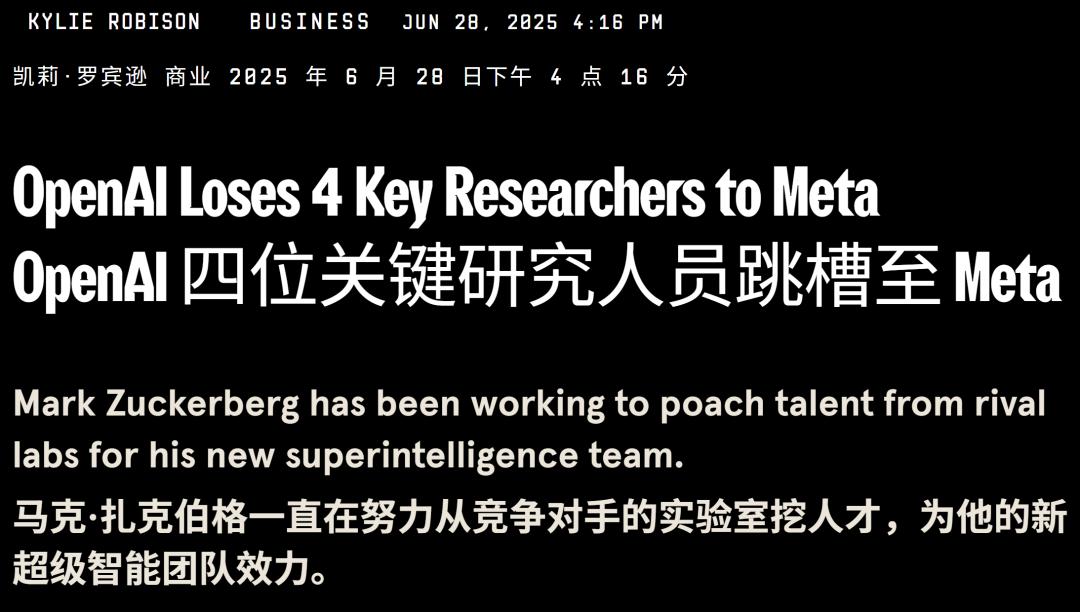 這一舉措背后,是連續(xù)數(shù)月的瘋狂工作和人才流失的危機(jī)。Meta新成立的超級(jí)智能實(shí)驗(yàn)室(Meta Superintelligence Lab,MSL)揮舞著巨額美元,挖角OpenAI的關(guān)鍵員工。扎克伯格開出上億美元的簽約獎(jiǎng)金,試圖網(wǎng)羅頂尖AI研究員。在這樣的誘惑下,OpenAI已有資深研究員陸續(xù)跳槽,六月末一次就有四位華人核心研究員離開,Slack賬號(hào)一夜變灰。