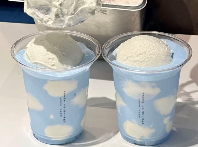 其“海浪奶云?荔枝藻藍蛋白雪球酪”藍白配色,頂部酸奶球配荔枝果肉,口感絲滑。