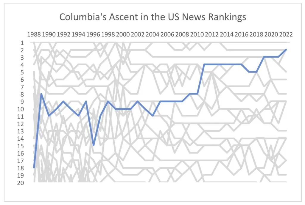 哥倫比亞大學(xué)在U.S. News排名中的上升軌跡(1988–2022)。2021年達(dá)到歷史最高第2位,但隨后的數(shù)據(jù)丑聞引發(fā)了巨大爭(zhēng)議。