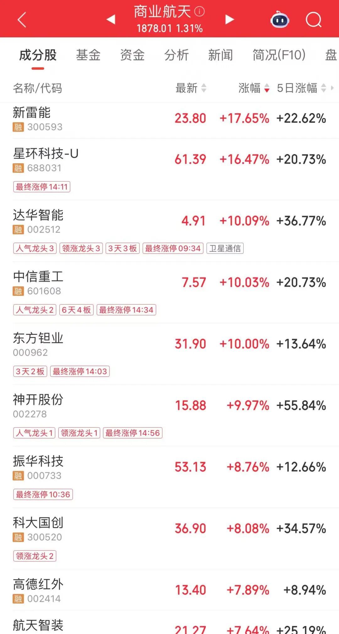 當日午后,商業(yè)航天板塊震蕩走高。截至收盤,達華智能、中信重工等多股漲停,新雷能漲超17%,高德紅外、航天智裝等漲幅居前。