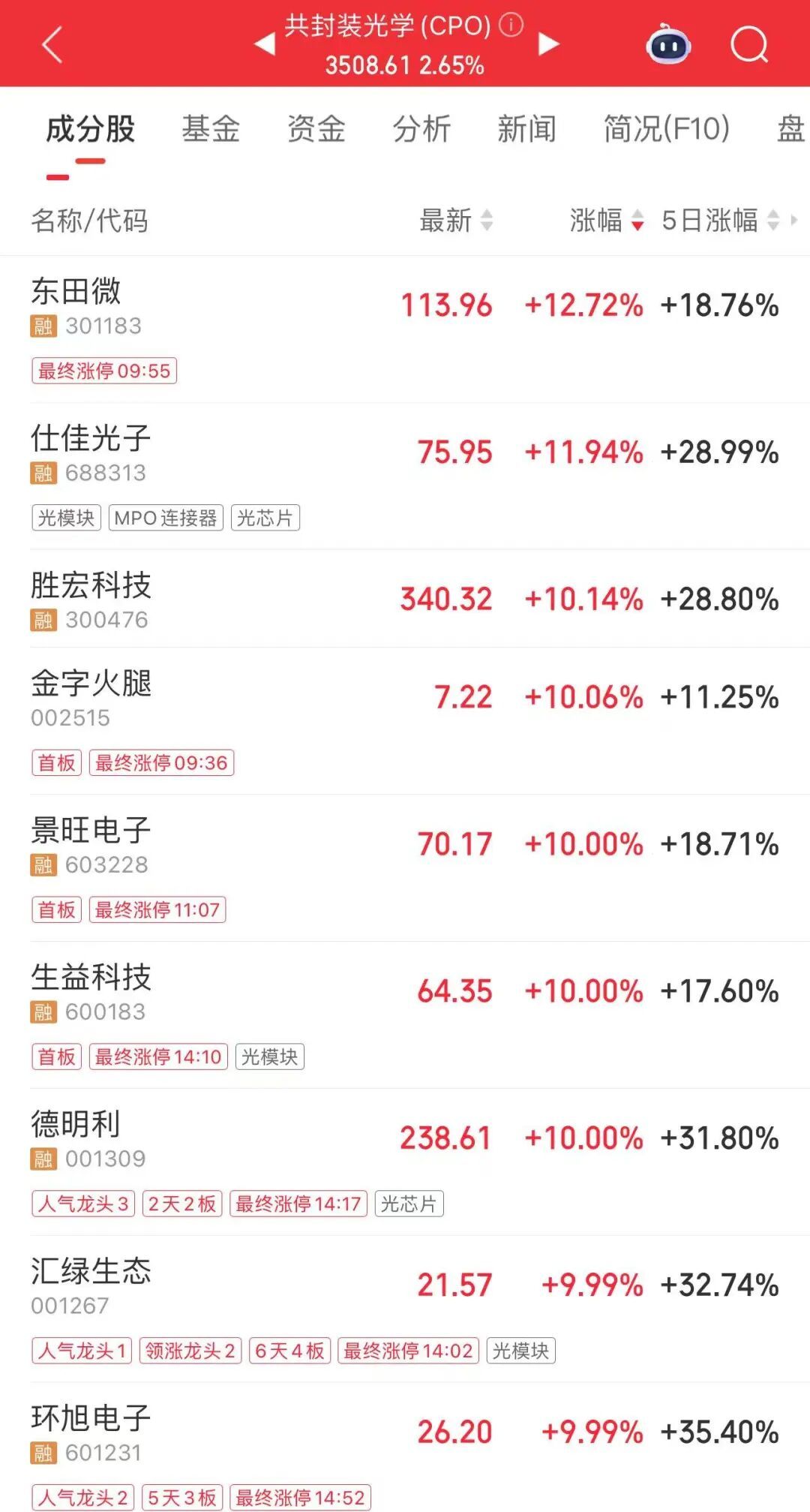 CPO概念持續(xù)活躍,金字火腿、景旺電子、生益科技、德明利、匯綠生態(tài)等多股漲停;東田微收盤漲超12%,早盤一度觸及“20CM”漲停,仕佳光子漲幅居前。