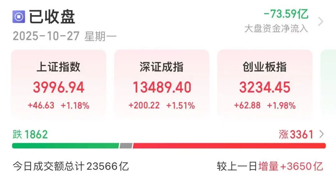 截至收盤,上證指數(shù)漲1.18%,收于3996.94點;深證成指漲1.51%,創(chuàng)業(yè)板指漲1.98%。全市場成交額超2.35萬億元,超3300只個股上漲。
