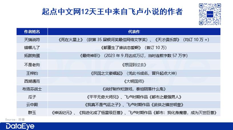 二是行業(yè)影響力顯著。飛盧被譽(yù)為網(wǎng)文界“黃埔軍?!保押隈R榜60%的作者、起點(diǎn)12位天王中10位都來自飛盧,其內(nèi)容創(chuàng)作能力得到了全行業(yè)的認(rèn)可。