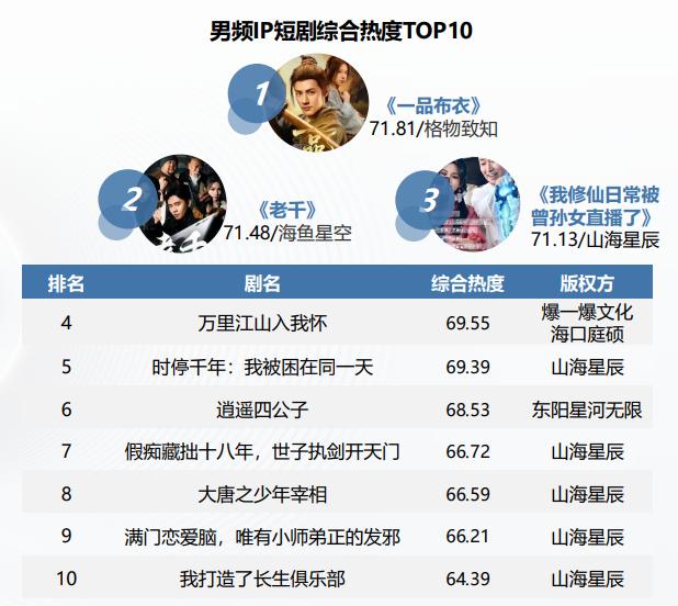 在男頻IP短劇綜合熱度TOP10中,《一品布衣》排名第一,《老千》位居第二,《我修仙日常被曾孫女直播了》排在第三。
