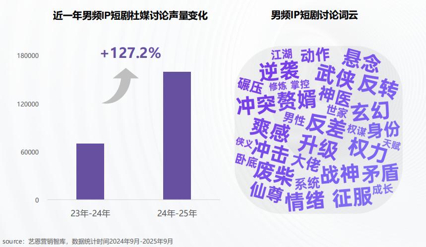 與之相反,男頻IP短劇正展現(xiàn)出巨大的潛力,成為新的藍(lán)海賽道。近一年,男頻IP短劇在社媒上的討論熱度同比增長127%,成為短劇市場新的增長點(diǎn)。