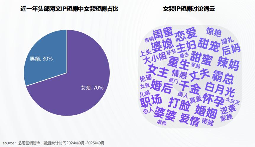 藝恩報(bào)告表明,在近一年的頭部網(wǎng)文IP短劇中,女頻短劇占比達(dá)70%,男頻僅占30%。女頻IP短劇市場競爭激烈,已進(jìn)入紅海階段。
