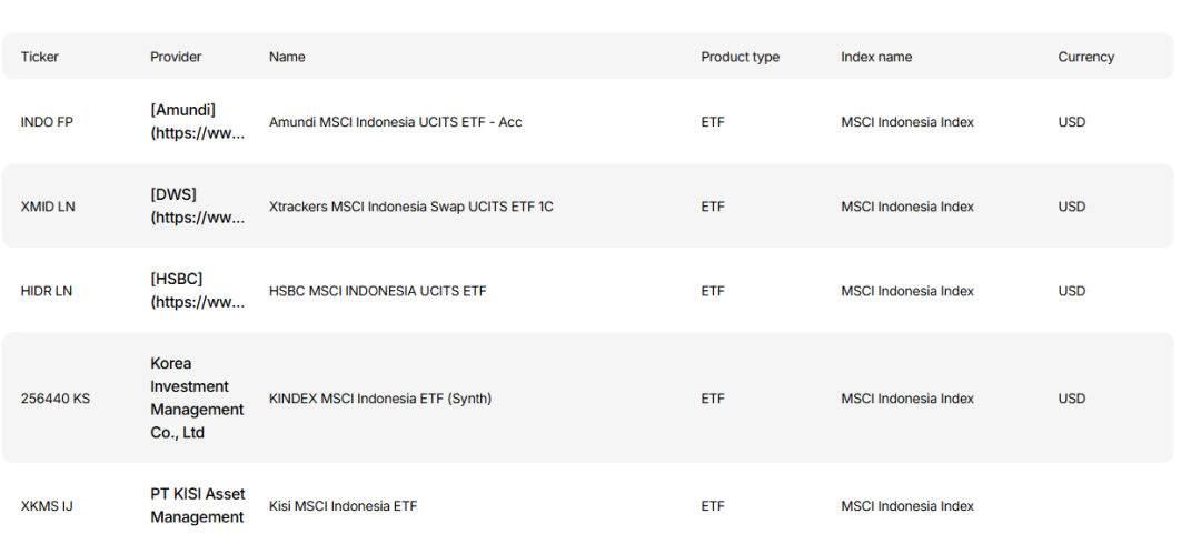 明晟公司官網(wǎng)顯示,有5只ETF基金跟蹤MSCI印尼指數(shù),但未公布具體規(guī)模。