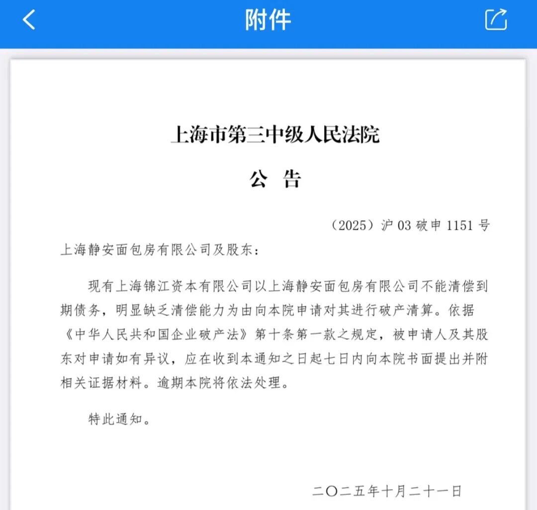 與此同時(shí),上海市第三中級(jí)人民法院公告顯示,其母公司上海錦江資本有限公司以靜安面包房“不能清償?shù)狡趥鶆?wù),明顯缺乏清償能力”為由,向法院申請(qǐng)破產(chǎn)清算,法院已于2025年10月21日啟動(dòng)法律程序。