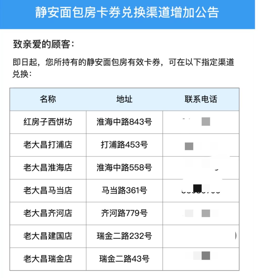 10月25日晚,靜安面包房官方微信發(fā)布公告稱,消費(fèi)者所持有的靜安面包房有效卡券,除了能在靜安面包房在營(yíng)門店兌換外,還可在紅房子西餅坊、老大昌等7家門店兌換。