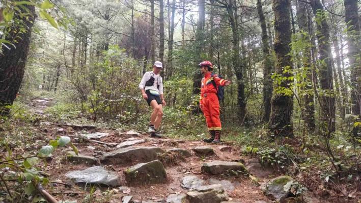 比賽日清晨,當?shù)谝慌鷧①愡x手還在熱身時,支隊的指戰(zhàn)員們早已各就各位。在山地賽段,25名指戰(zhàn)員分布在崎嶇的林區(qū)賽道上,他們的身影與蒼山的綠意融為一體,隨時準備在選手需要時伸出援手。