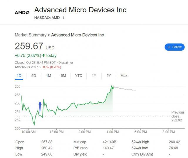 報道傳出后,美東時間27日周一,美股早盤小幅轉(zhuǎn)跌的AMD股價迅速轉(zhuǎn)漲,日內(nèi)漲幅曾超過1%,此后保持漲勢,尾盤漲幅擴大,收漲將近2.7%,連續(xù)兩個交易日刷新收盤最高紀錄。