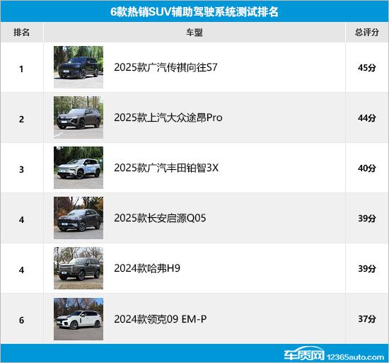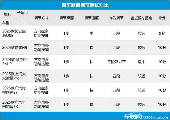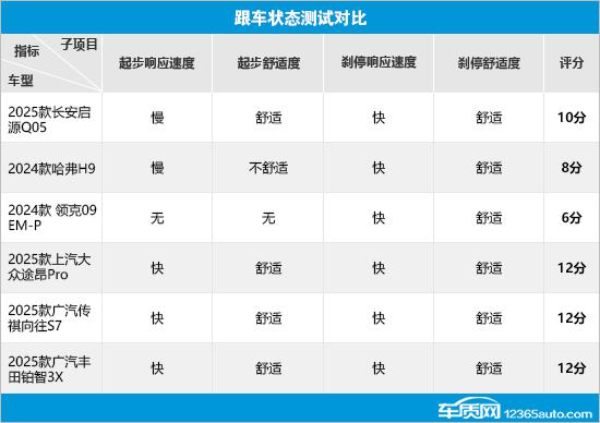 在跟車狀態(tài)測試中,途昂Pro、傳祺向往S7和鉑智3X均獲滿分,表現(xiàn)出色。而領克09 EM - P評分僅6分,排名墊底,原因是其不支持自動跟車起步功能,起步響應速度和起步舒適度兩項未得分。
