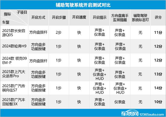 橫向?qū)Ρ冉Y果顯示,除2025款長安啟源Q05(以下簡稱:長安啟源Q05)和2024款領克09 EM - P(以下簡稱:領克09 EM - P)采用方向盤撥桿開啟外,其余車型均用方向盤多功能按鍵開啟。開啟步驟上,只有長安啟源Q05需2步,其余車型僅需1步。值得一提的是,6款車型儀表盤均有圖標提示,且都提供聲音提醒,2025款上汽大眾途昂Pro(以下簡稱:途昂Pro)和2025款廣汽傳祺向往S7(以下簡稱:傳祺向往S7)還在HUD抬頭顯示中融入提示功能,讓駕駛員更清晰了解輔助駕駛狀態(tài)。此外,6款車型均配備方向盤離手監(jiān)測提醒功能,其中傳祺向往S7提供三種提醒方式,表現(xiàn)相對更佳。