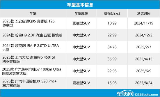 本期選取的6款車型包括4款中大型SUV和2款緊湊型SUV,涵蓋自主和合資品牌,既有燃油車也有新能源車。