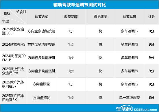 在車速調(diào)節(jié)項目中,6款車型整體表現(xiàn)符合預期。雖調(diào)節(jié)方式有差異,但在調(diào)節(jié)步驟和調(diào)節(jié)速度方面表現(xiàn)一致。不過在調(diào)節(jié)幅度方面,只有2025款廣汽豐田鉑智3X(以下簡稱:鉑智3X)不支持多車速調(diào)節(jié),導致其失分。