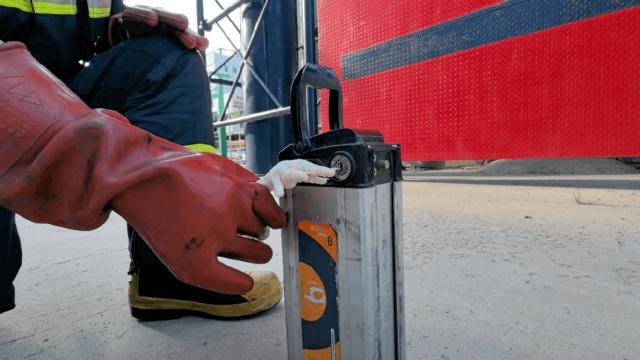 消防員找來(lái)一個(gè) 48v 的電動(dòng)自行車電池,戴上絕緣手套,用一根雞爪模擬人手,將一個(gè)圓形鐵片固定在雞爪上。