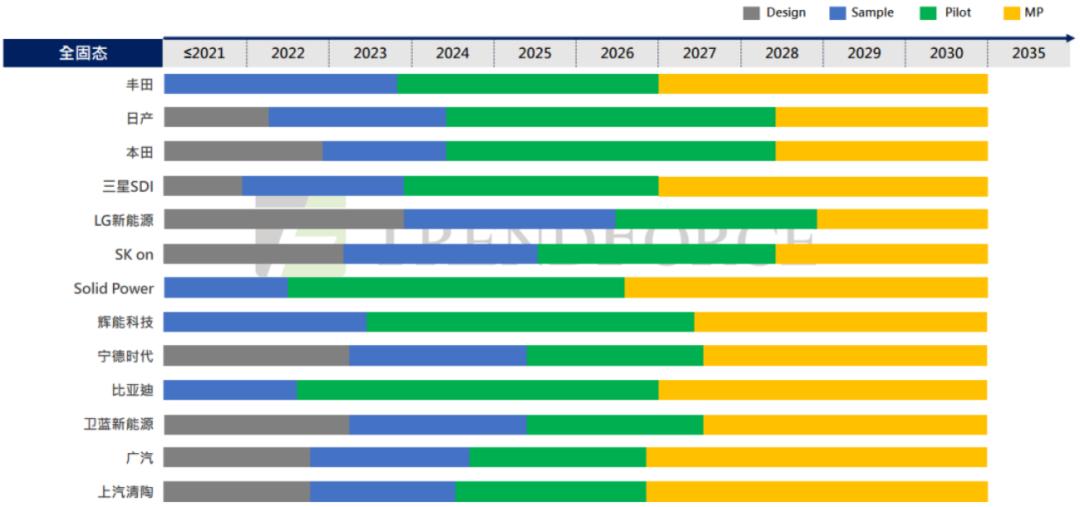 目前,寧德時代、國軒高科、豐田、三星SDI等全球領(lǐng)先制造商的全固態(tài)電池已進(jìn)入試制階段,并給出量產(chǎn)時間表。