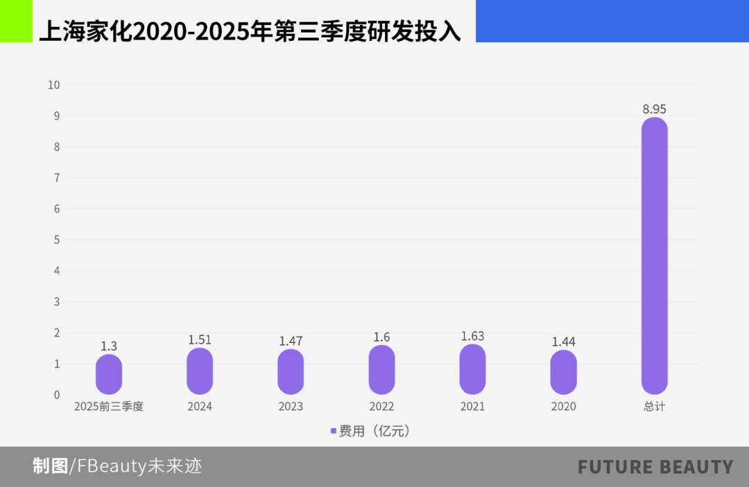 作為國內(nèi)日化行業(yè)最早建立研發(fā)中心的企業(yè)之一,上海家化始終堅持在研發(fā)上投入。財報數(shù)據(jù)顯示,2025年前九個月,公司研發(fā)投入達(dá)1.3億元,同比增長25%。若將時間線拉長,自2020年至今的六年間,其研發(fā)投入累計已近9億元。