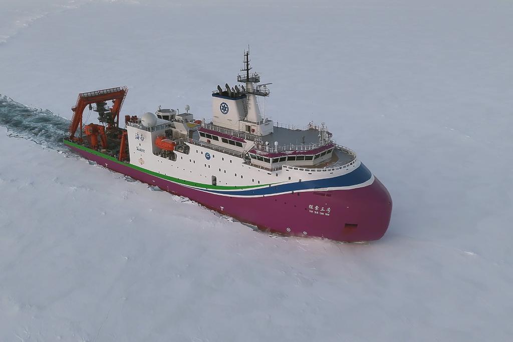 ‘探索三號’在北極密集冰區(qū)破冰航行。(自然資源部供圖)