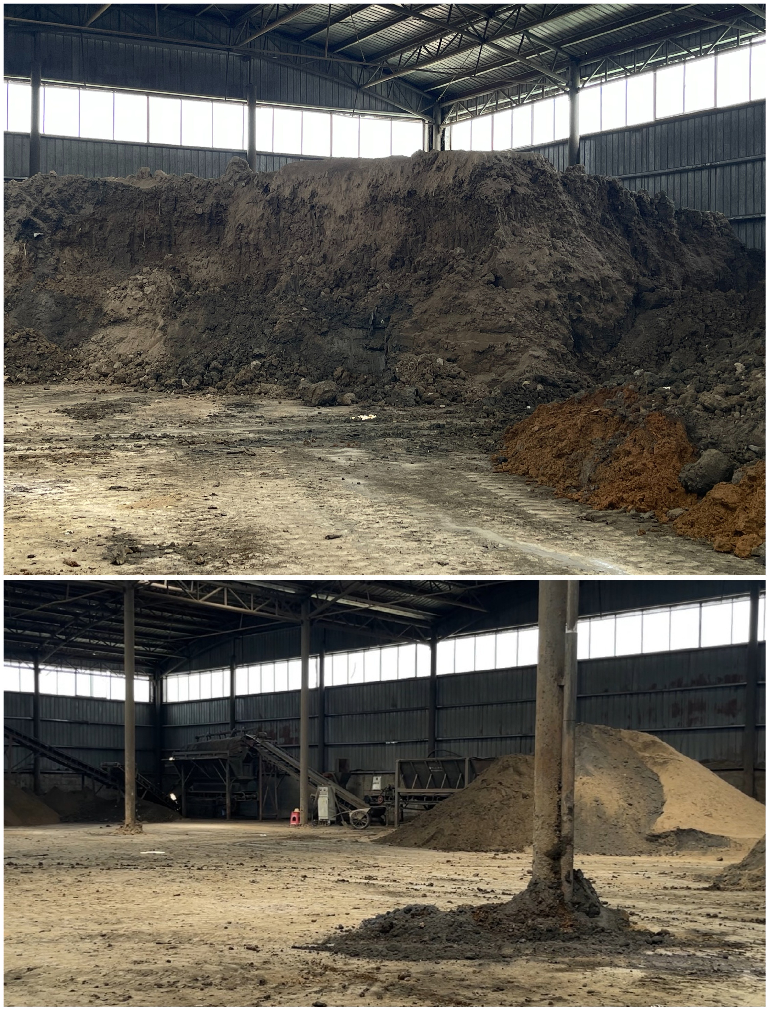 淮安辰能生態(tài)農(nóng)業(yè)科技有限公司廠房內(nèi)堆放的各種污泥、生物灰等原料。
