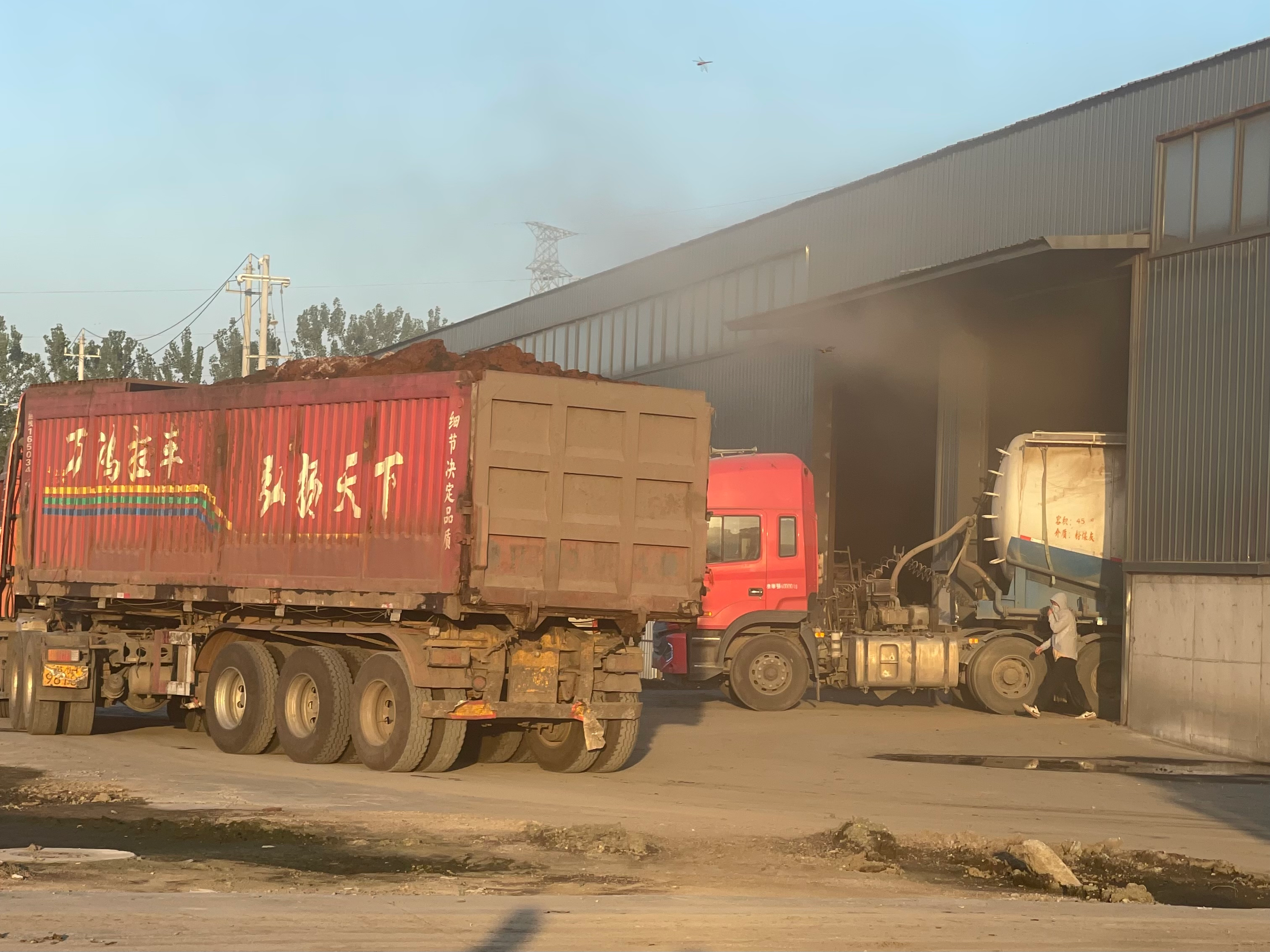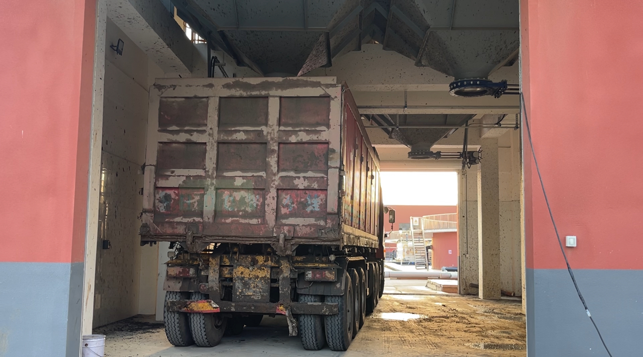 污泥、生物灰運輸車輛在淮安辰能生態(tài)農(nóng)業(yè)科技有限公司的堆土廠房內(nèi)卸貨。本文圖片 均由澎湃新聞影子調(diào)查隊 攝