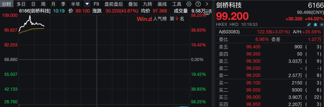另外一只新股劍橋科技,早盤一度漲超50%,截至發(fā)稿,最新漲幅為44%。劍橋科技主要從事設(shè)計(jì)、開發(fā)及銷售連接及數(shù)據(jù)傳輸設(shè)備。