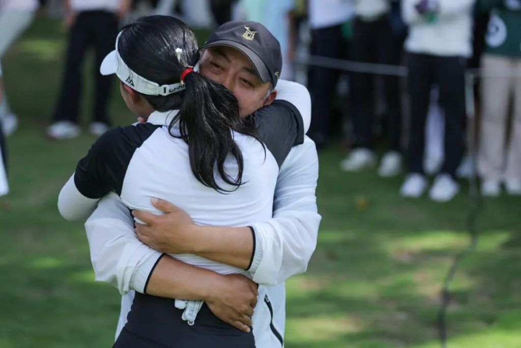 劉宇婕在廣東女子公開賽奪冠后與父親劉國梁擁抱慶祝。圖片來自:女子中巡賽官網(wǎng)。