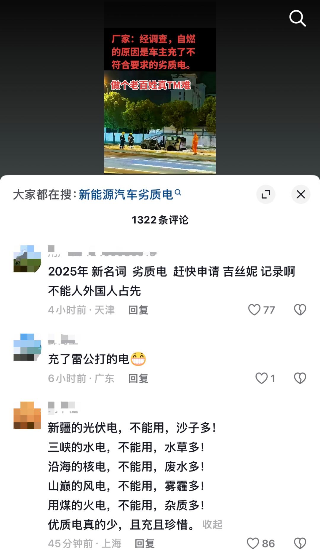 還有網(wǎng)友調侃,“光伏電,不能用,沙子多!水電,不能用,水草多!核電,不能用,廢水多!風電,不能用,霧霾多!火電,不能用,雜質多!優(yōu)質電真的少,且充且珍惜?!?/p>