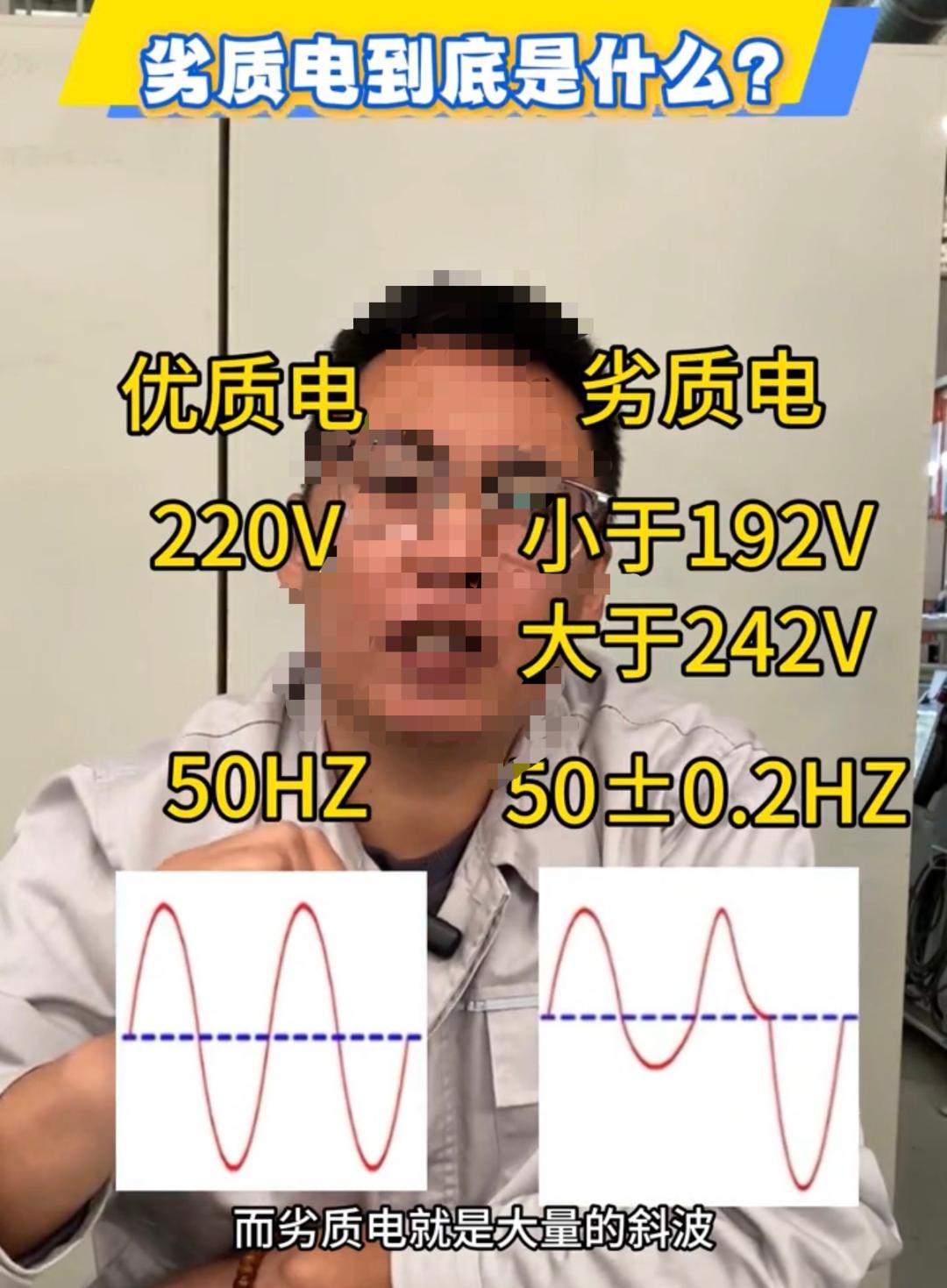 “優(yōu)質電”的電壓為220V;電力頻率為50HZ;波形畸變?yōu)檎也ā6妷盒∮?92V,大于242V;電力頻率偏離50正負0.2HZ;波形畸變出現(xiàn)大量斜波,則屬于“劣質電”。