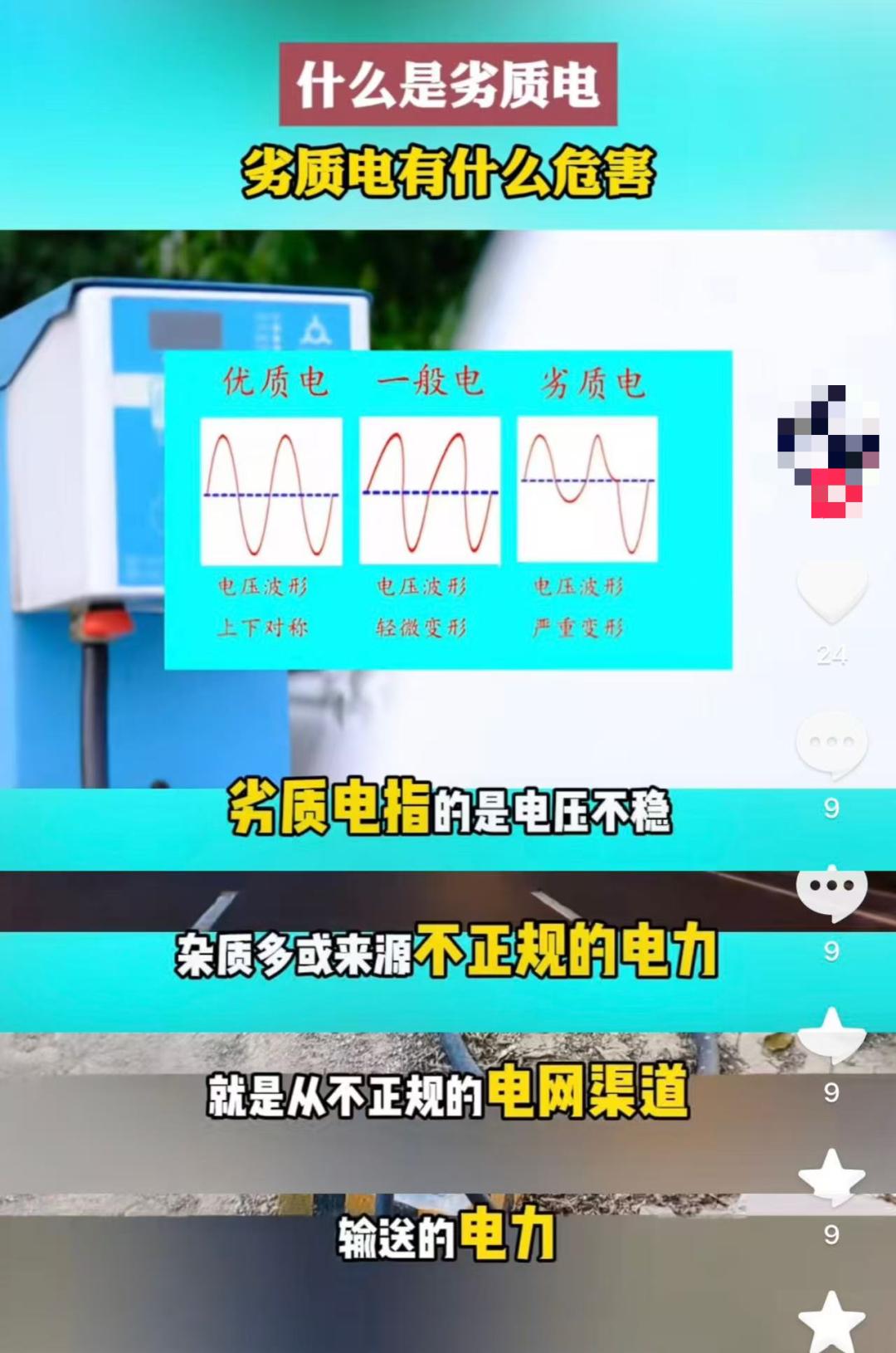 更有視頻稱,“劣質電指的是電壓不穩(wěn),雜質多或來源不正規(guī)的電力,就是從不正規(guī)的電網(wǎng)渠道輸送的電力?!?/p>