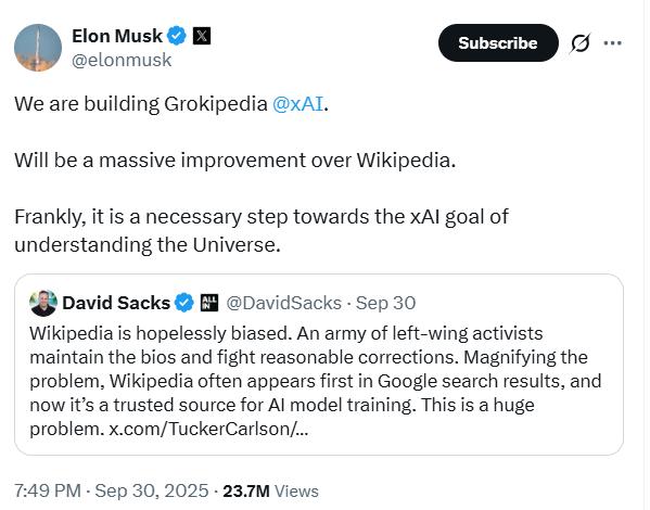 馬斯克于9月29日首次透露構(gòu)建Grokipedia的計劃,這是對特朗普的AI事務(wù)負責(zé)人、硅谷投資人戴維·薩克斯一篇帖文的回應(yīng)。薩克斯稱維基百科“無可救藥地充滿偏見”。