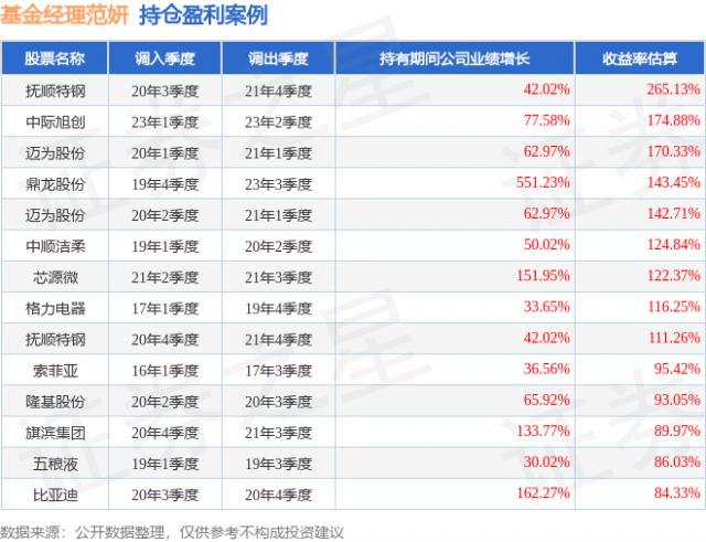 范妍管理的圓信永豐優(yōu)加生活基金于2020年3季度買入撫順特鋼,持有1年又1個季度后,在2021年4季度賣出。持有期間的估算收益率為265.13%,且在2020年到2021年,撫順特鋼的年報歸屬凈利潤增幅達(dá)42.02%。