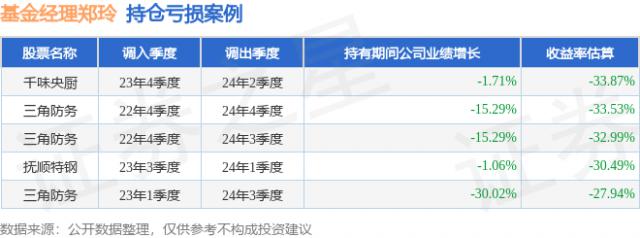 鄭玲管理的國(guó)聯(lián)鑫思路混合A基金在2023年4季度買入千味央廚,持有2個(gè)季度后,在2024年2季度賣出。持有期間的估算收益率為 -33.87%,2023年到2024年千味央廚的年報(bào)營(yíng)業(yè)總收入降幅為1.71%。