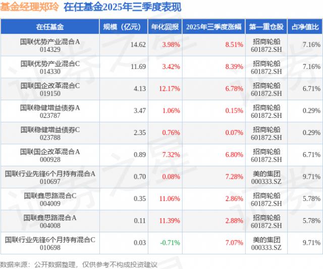 2025年三季度鄭玲旗下基金表現(xiàn),國(guó)聯(lián)優(yōu)勢(shì)產(chǎn)業(yè)混合A漲幅8.51%