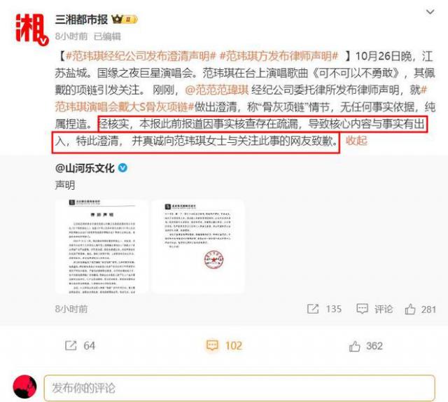 10月28日晚,范瑋琪忍無(wú)可忍,通過(guò)經(jīng)紀(jì)公司發(fā)布律師聲明回應(yīng)此事。聲明指出,范瑋琪在演唱會(huì)上佩戴大S骨灰項(xiàng)鏈?zhǔn)遣粚?shí)信息,是一些網(wǎng)絡(luò)用戶(hù)憑空捏造的,媒體未經(jīng)核實(shí)就報(bào)道,產(chǎn)生了惡劣影響。聲明還直言,這些網(wǎng)絡(luò)用戶(hù)和媒體借逝者話題制造噱頭牟取帶血的流量,突破了社會(huì)公序良俗底線,范瑋琪將以法律手段維護(hù)自身合法權(quán)益。